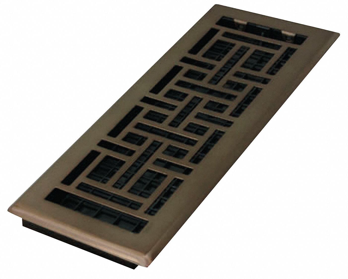 The descriptionFloor register, louvered, floor register, overall height (in.) 7 1/2 in., overall width (in.) 15 1/2 in., depth (in.) 14 in., 1/2 in., brown finish, to be used With -, free area (Sq.-In.)